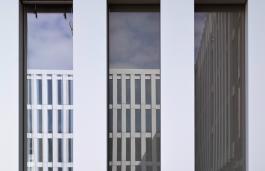 Die Brüstungen der Balkone ergänzen den Baukörper wieder zur einer klaren Kante.