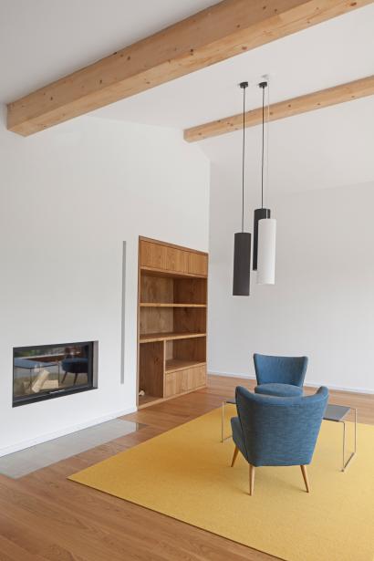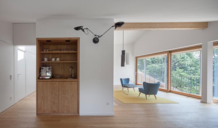 Unter dem Dach befinden sich die Schlafräume mit Bädern und Ankleide, sowie eine großzügige Wohnebene, die sich über ein Panoramafenster nach Süden zu den Bergen orientiert.