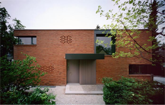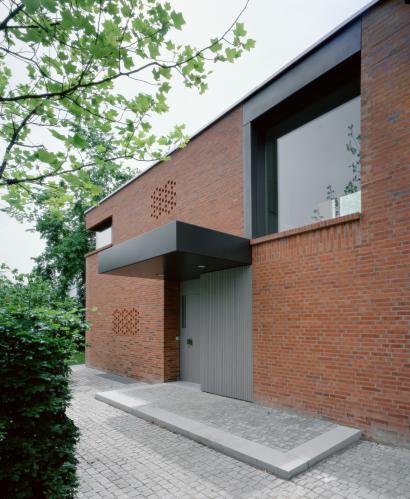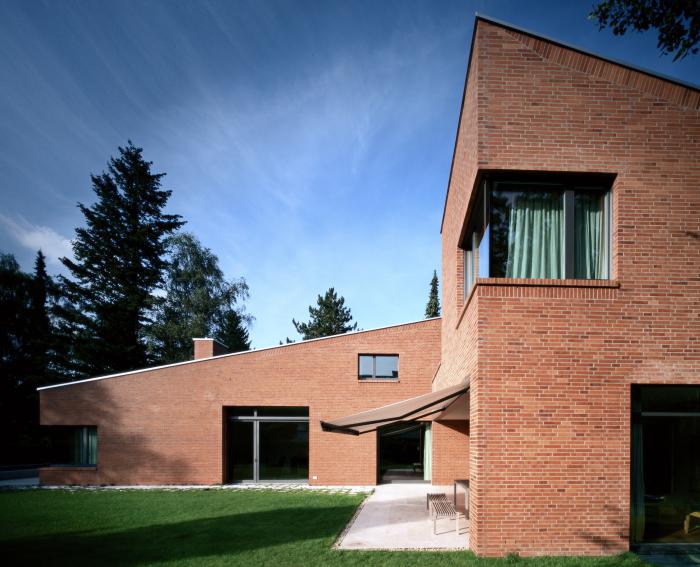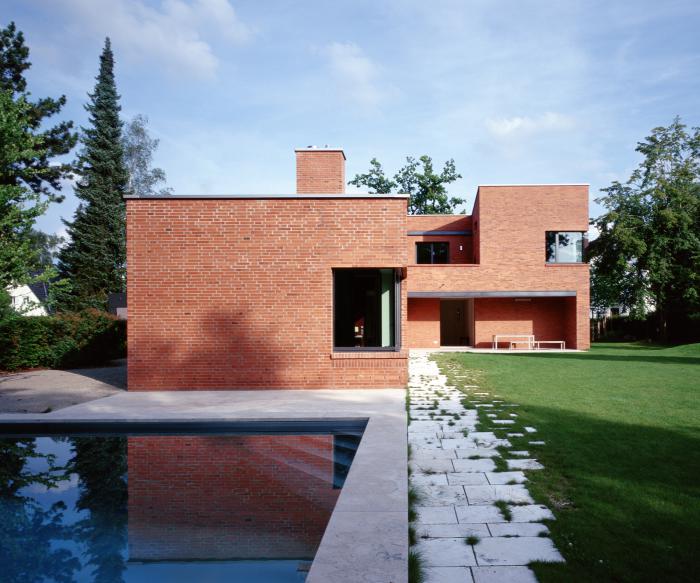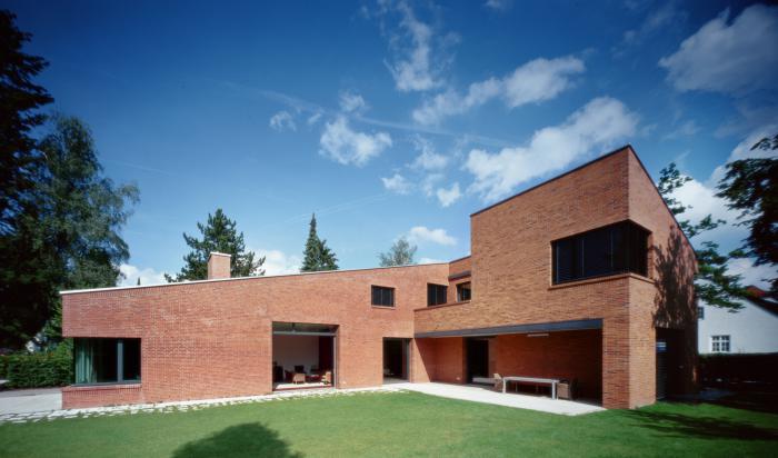 Der Bau ist aus wenigen Materialien gefügt. Das flachgestreckte Ziegelformat überzieht als Vormauerwerk den kräftigen Baukörper. Die Garage und Bauelemente wie Vordächer, Verkleidungen sowie die Fenster sind mit dunklem Metall verblendet. Übergroße Fenstertüren in Holz-Alu-Konstruktion lassen sich hinter Vorsatzschalen in den Außenwänden verschieben und ermöglichen so die vollständige Öffnung zum Garten.