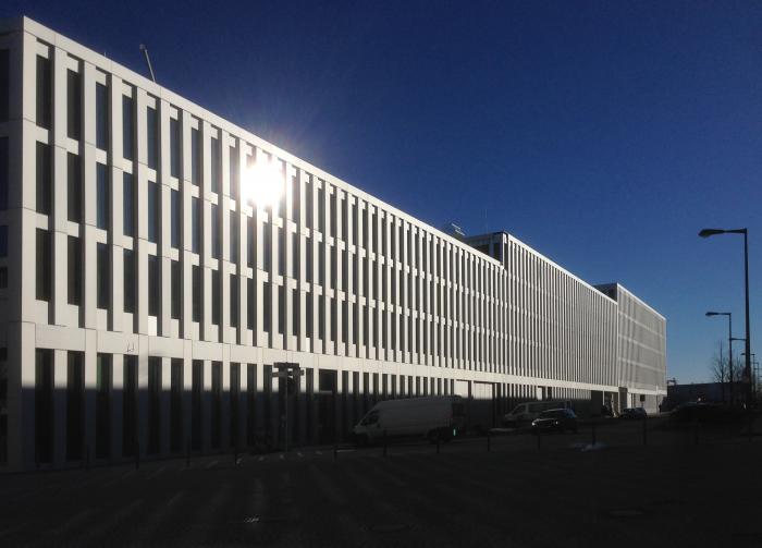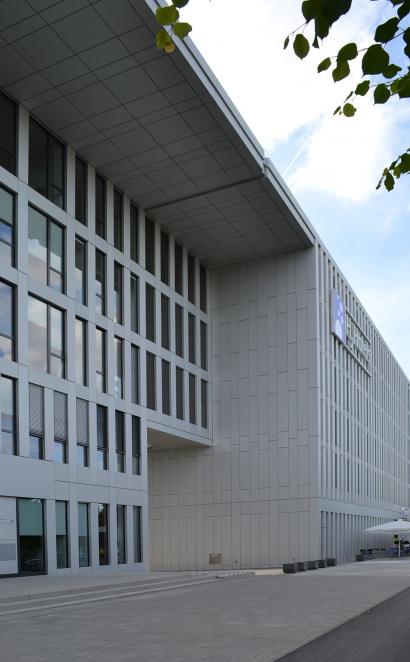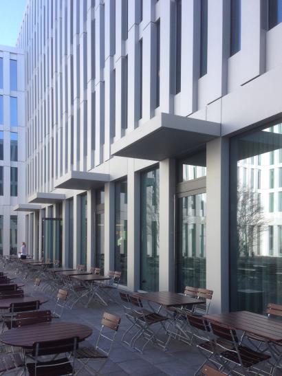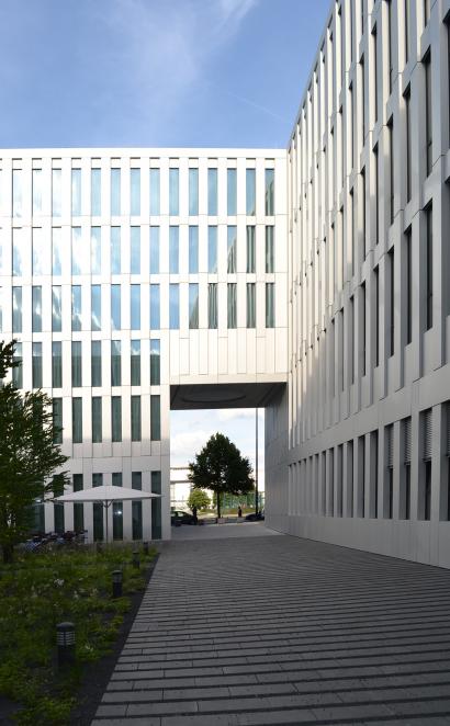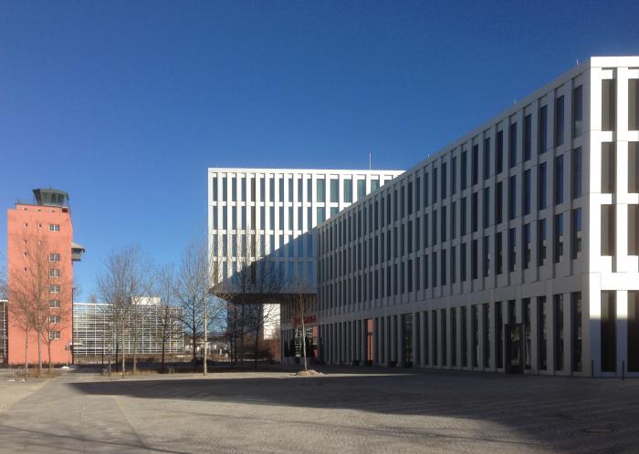 zur Materialwahl Aluminium, zur Erinnerung an die Flugzeuge, die den alten Flughafen Riem prägten. Die übergeordnete, streng gerasterte Fassade wird durch die unterschiedlichen Nutzungsraster und Geschosshöhen in Bewegung gebracht, sie legt sich wie ein flexibler Stoff um den Baukörper.